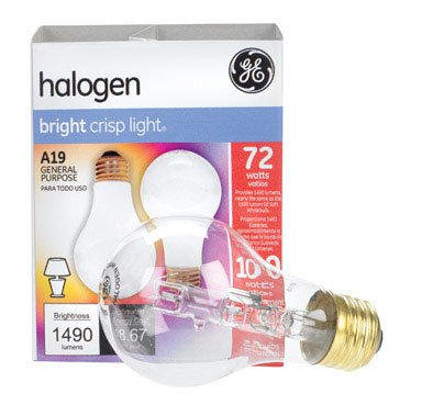 GE 63005 72-Watt 1490-Lumen General Purpose Halogen A19 Light Bulb, Soft White, 2-Pack. 1490-Lumen output and 72-Watts used, Lumens measure brightness of a light bulb, Watts measure electricity used to create light. Saves Energy - has similar Lumens(light output) as a standard 100-Watt but only uses 72-Watts. This Halogen bulb has an A19-Shape and rated life of 1000-Hours. Lumen is the new Watt - Better technology provides the same amount of Brightness(lumens) while using less Electricity(Watts). This Soft White Halogen bulb is fully dimmable and instantly bright. The frost reduces glare and overall uses 28-percent less energy than a regular bulb. Halogen lamps provide a small, white light source with excellent color rendering. Unlike standard incandescent lamps, halogen lamps use a halogen gas which allows the bulbs to burn longer without sacrificing light output. Compared to incandescent lamps, halogen lamps provide crisp white light, excellent beam control, compact size, high lumen maintenance, and a longer life. To save energy costs, find the bulbs with the light output(lumens) you need, then choose the one with lowest Watts